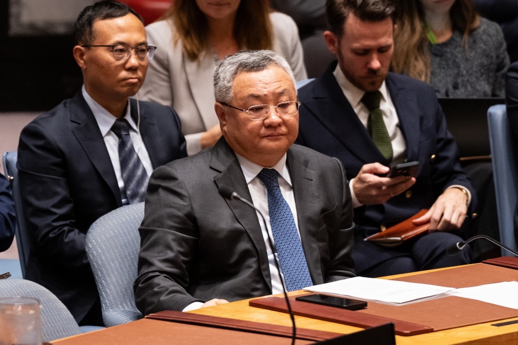 2025年9月18日,美国纽约,中国常驻联合国代表傅聪出席安理会中东局势会议。视觉中国 图