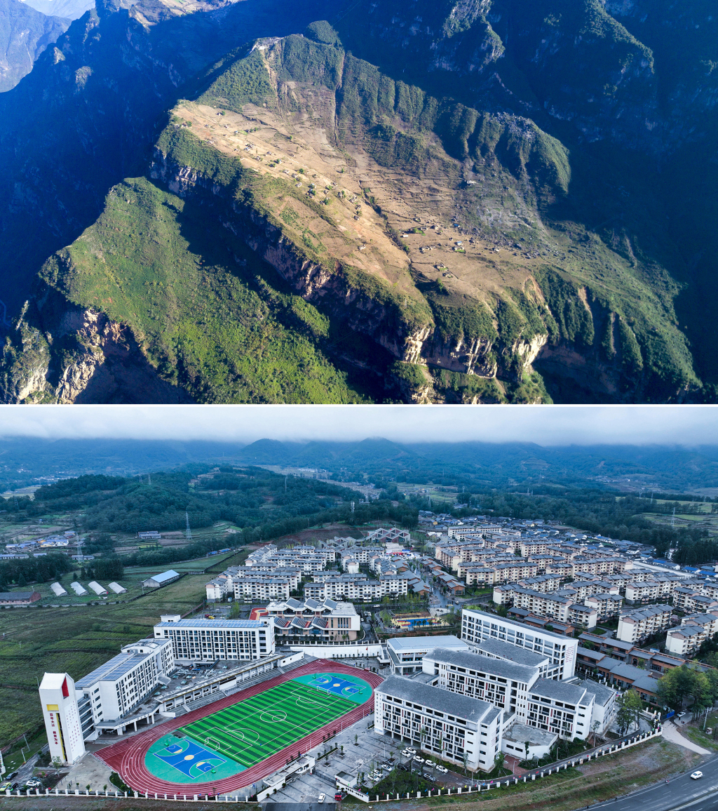 上图为2016年,四川阿土列尔村,处于美姑河大峡谷断坎岩肩斜台地的“悬崖村”。下图为2021年,悬崖村搬迁至县城易地扶贫安置点。视觉中国 图