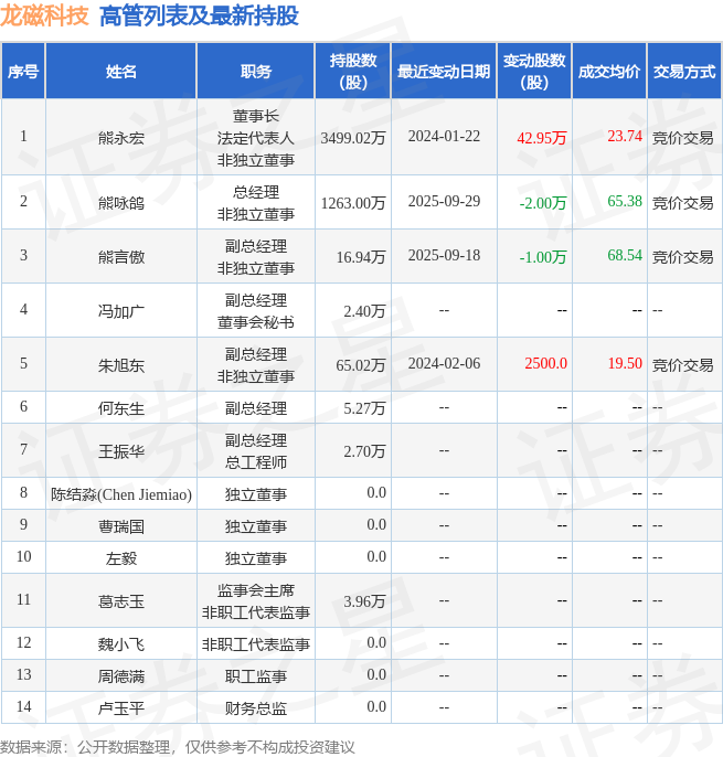 龙磁科技近半年内的董监高及核心技术人员增减持详情如下: