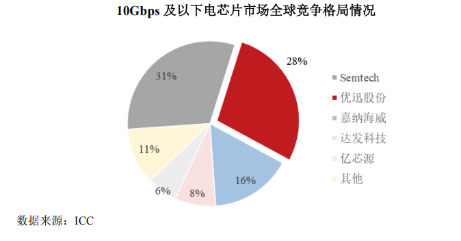 根据第三方机构ICC的统计,在2024年度,优迅股份在10Gbps及以下速率的光通信电芯片细分市场中,市场份额位列中国第一、全球第二。