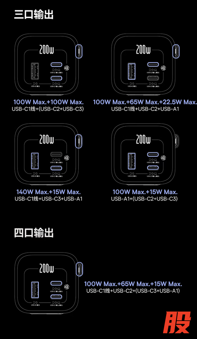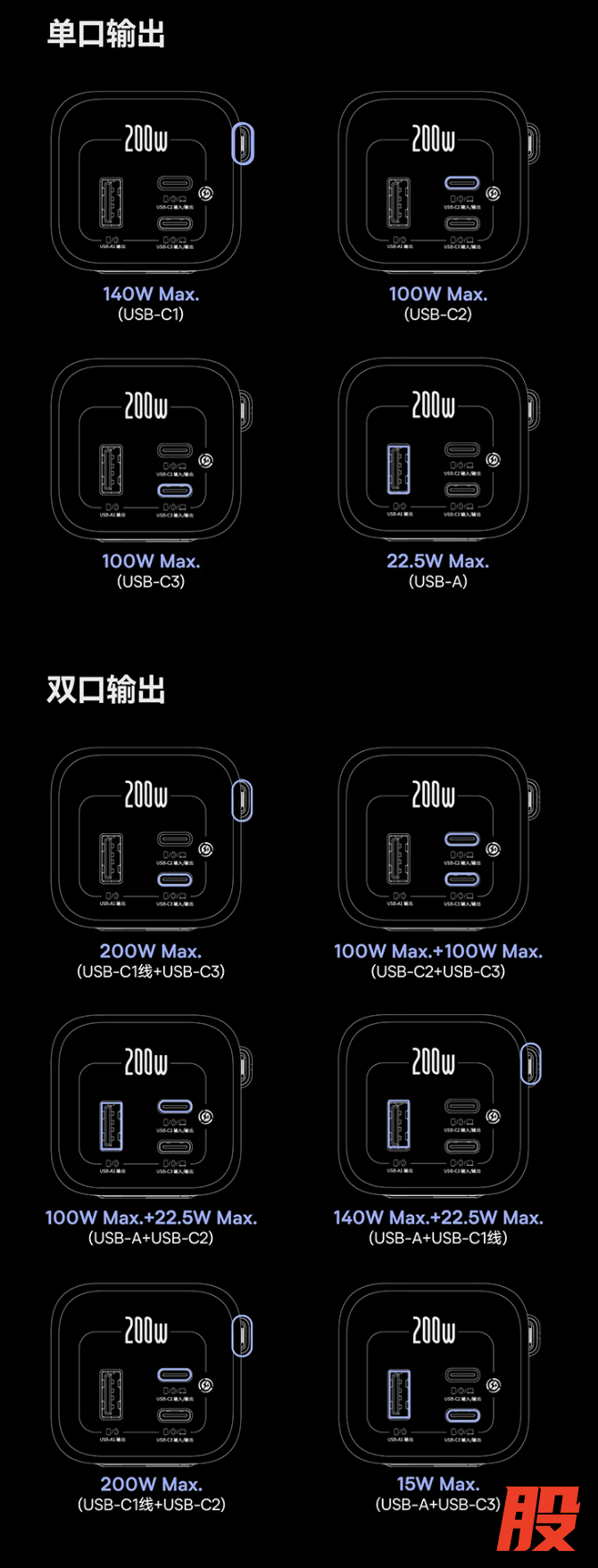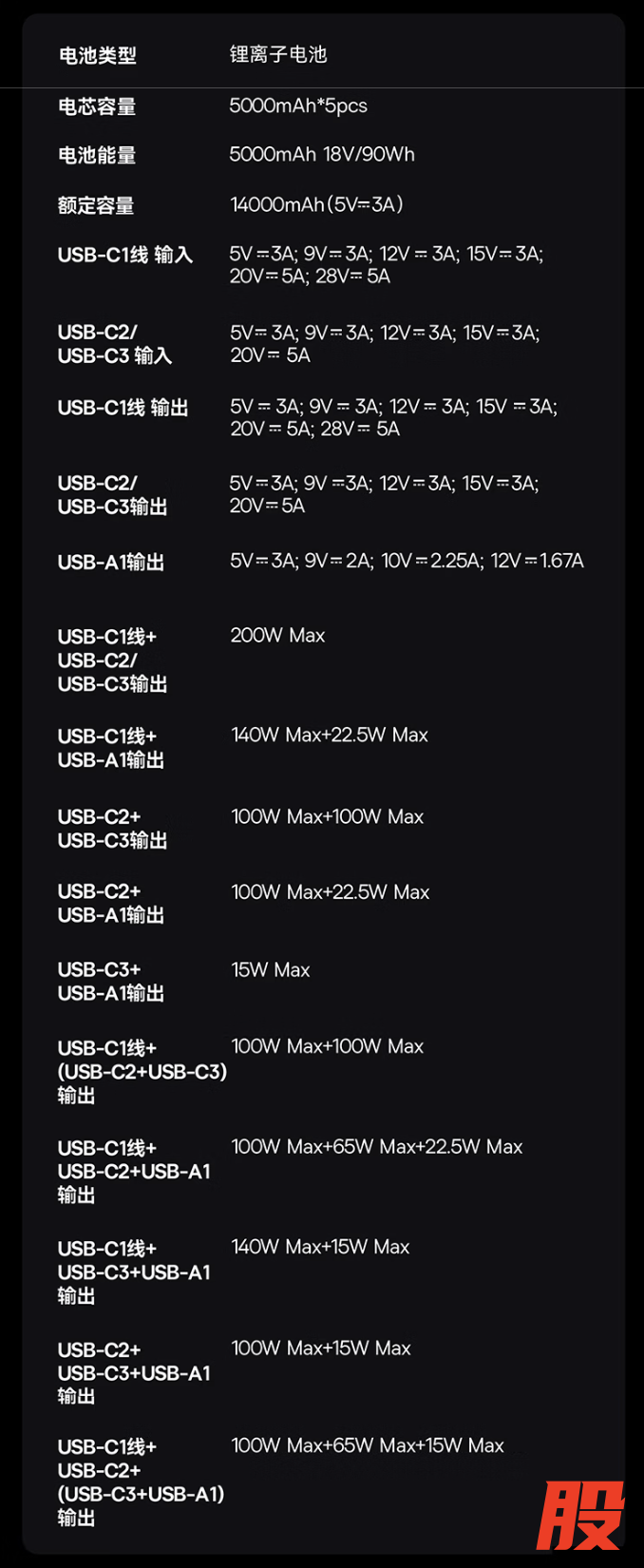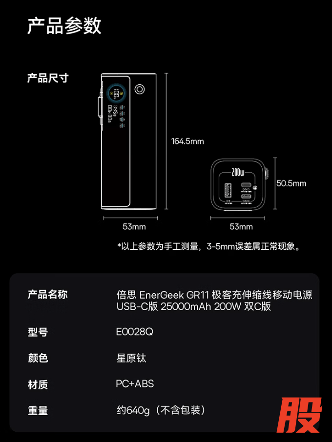 该移动电源整体采用银色配色,带有 LED 数显屏,提供 1 根伸缩式 USB-C 线及 1 根分离式 USB-C 线,其中 USB-C 线和 USB-C 接口均支持 100W 输出,USB-A 接口支持 22.5W 输出,在双口模式下可实现 100W + 100W 供电。
