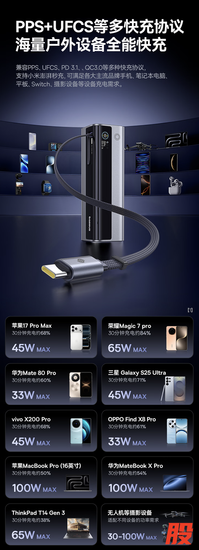 该移动电源支持 PPS、UFCS、PD 3.1、QC 3.0 等协议,支持小米澎湃秒充,可为华为 Mate 80 Pro 提供至高 33W 功率、为 vivo X200 Pro 提供至高 45W 功率。